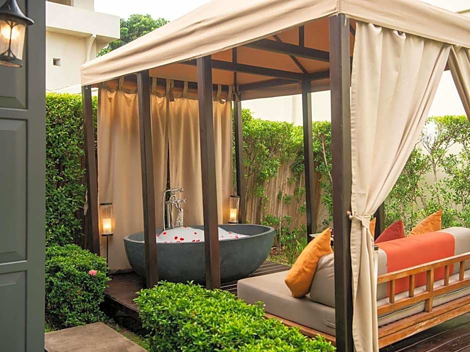 This villa features a decoration of Lao silk and artifacts. A garden with a private plunge pool is included. Bathrooms come with a rain shower, bathtub, and dressing area.
